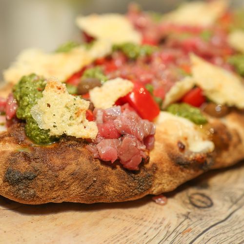 Ingredienti: Base pizza in pala alla romana, mozzarella, carpaccio di manzo, pomodori perle rosse, chips di parmigiano, olive taggiasche denocciolate, pesto di basilico, golden bbq