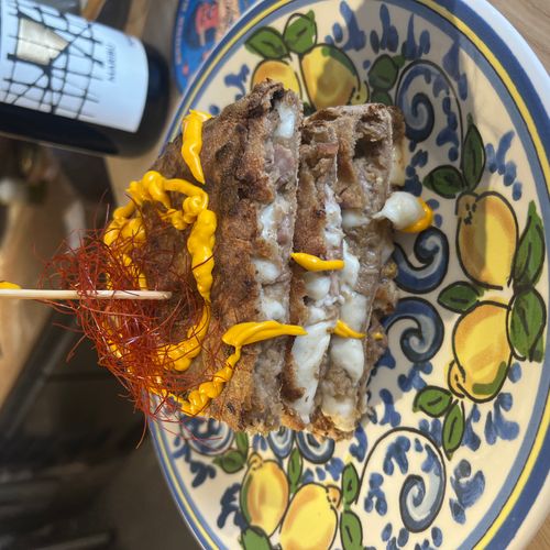 Ingredienti: Mozzarella di bufala dop all'uscita, lonzino artigianale (macelleria Alfonso di Isnello), rucola, datterino rosso, fonduta di parmigiano