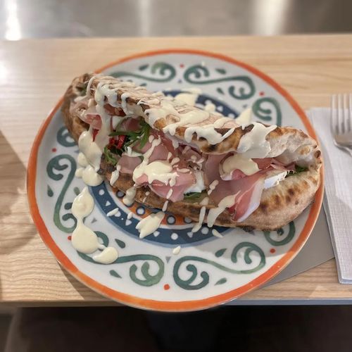 Ingredienti: Base pizza in pala alla romana,rucola, crudo di parma, datterino rosso, stracciatella, parmigiano