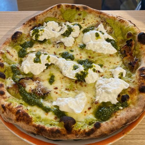 Ingredienti: velutata di zucchine,mozzarella,stracciatella,pancetta(macelleria alfonso),pesto di basilico, grana padadno grattugiato