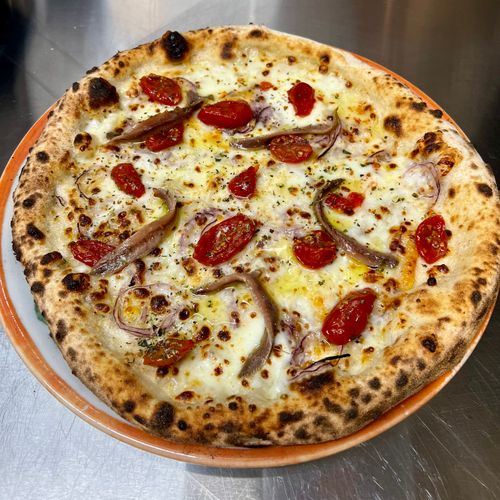 Ingredienti: mozzarella, cipolla rossa, acciughe, pecorino,datterino rosso semi dry,origano,olio