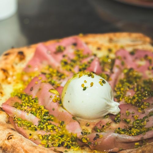 Ingredienti: Mozzarella, mortadella, burrata, pesto di pistacchio, granella di pistacchio