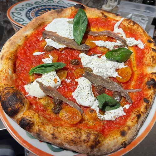 Ingredienti: Salsa di pomodoro,stracciatella, Datterino giallo in acqua di mare,olive taggiasche, acciughe,basilico